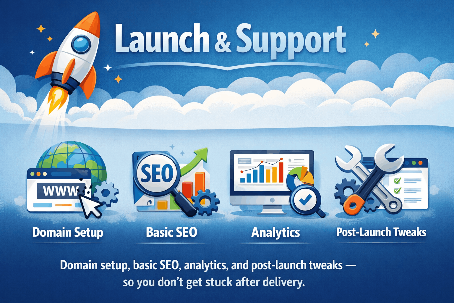 We start with a short brief, prepare the structure, then move to design and responsive build. Before launch we test on mobile/desktop, connect analytics, and do basic on-page SEO. After publishing — we stay available for quick fixes and small updates.